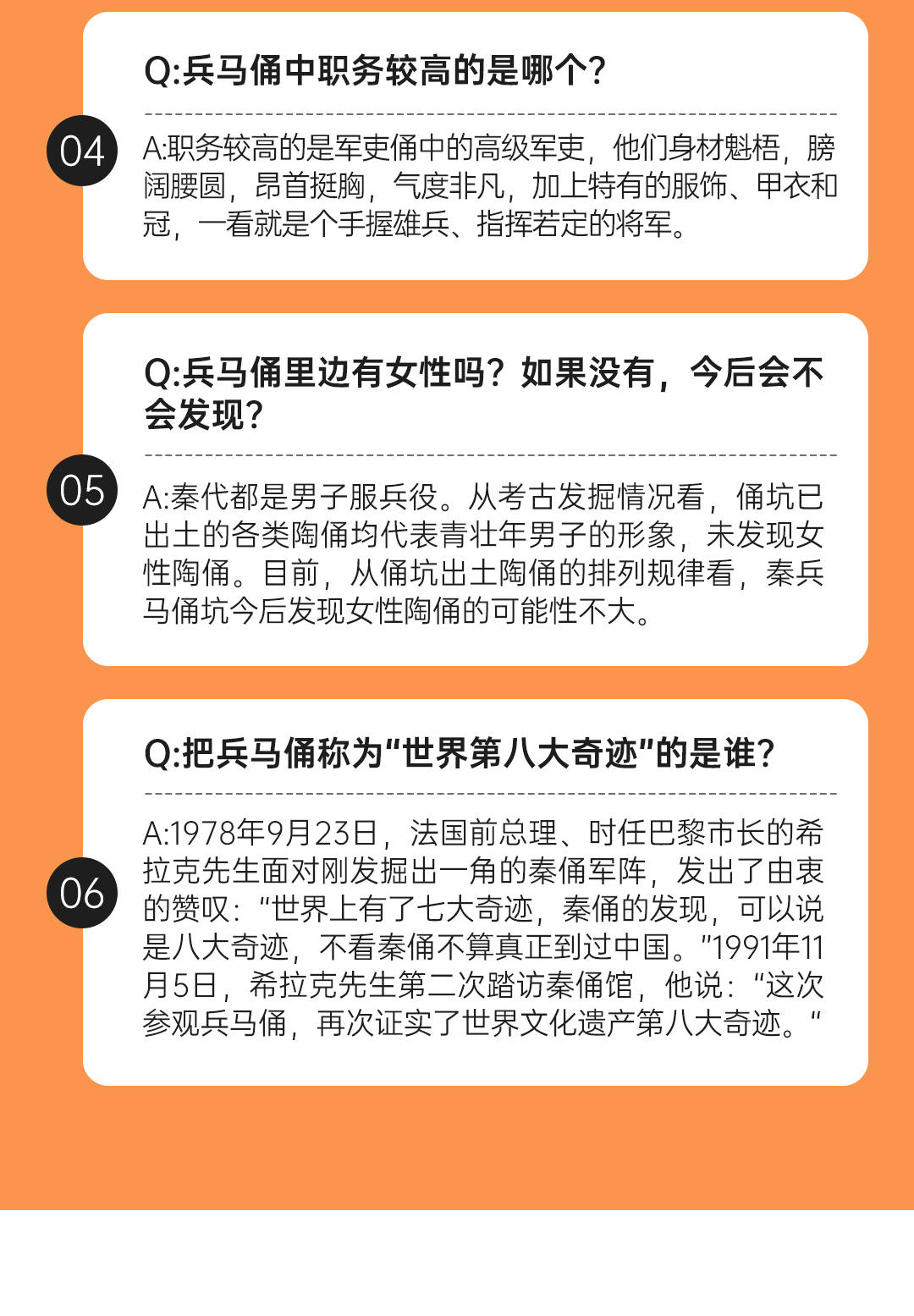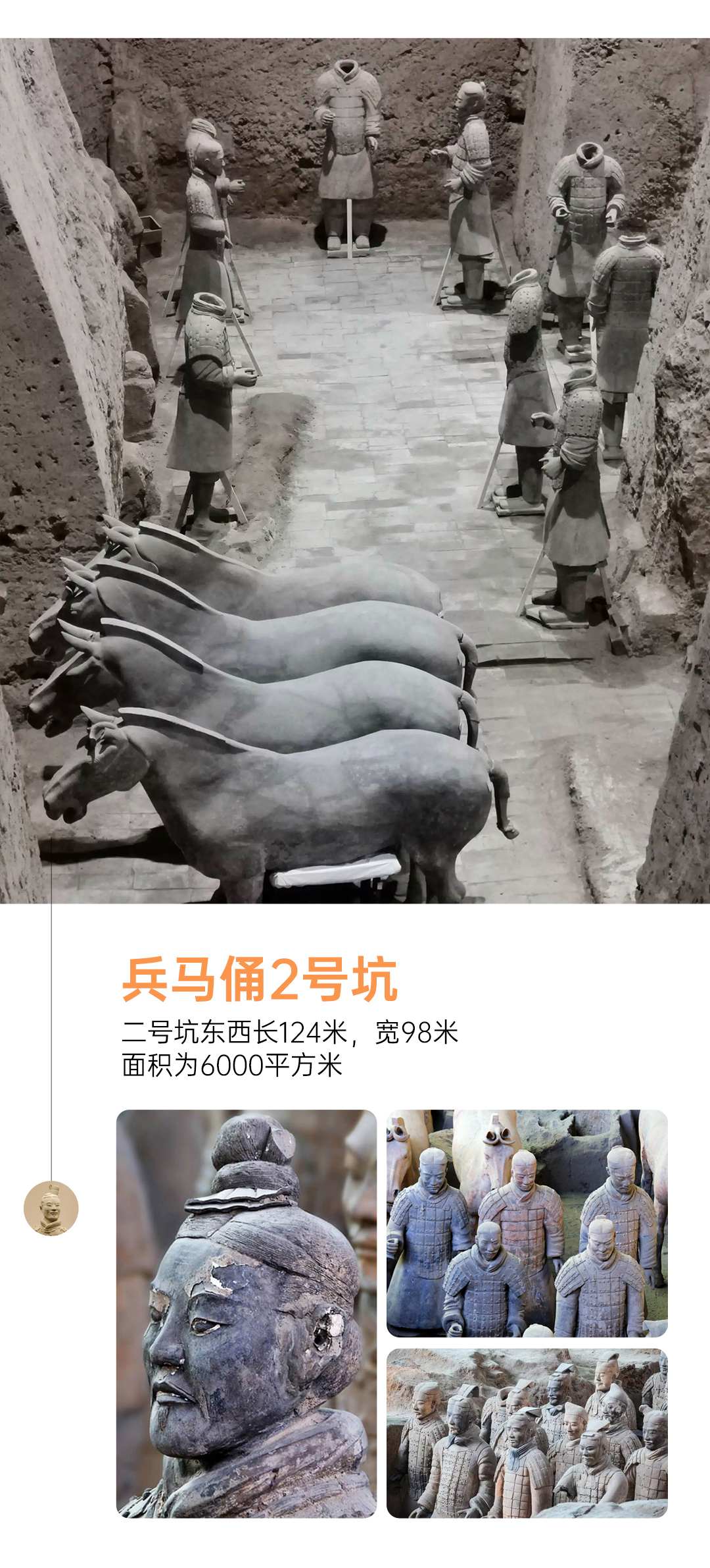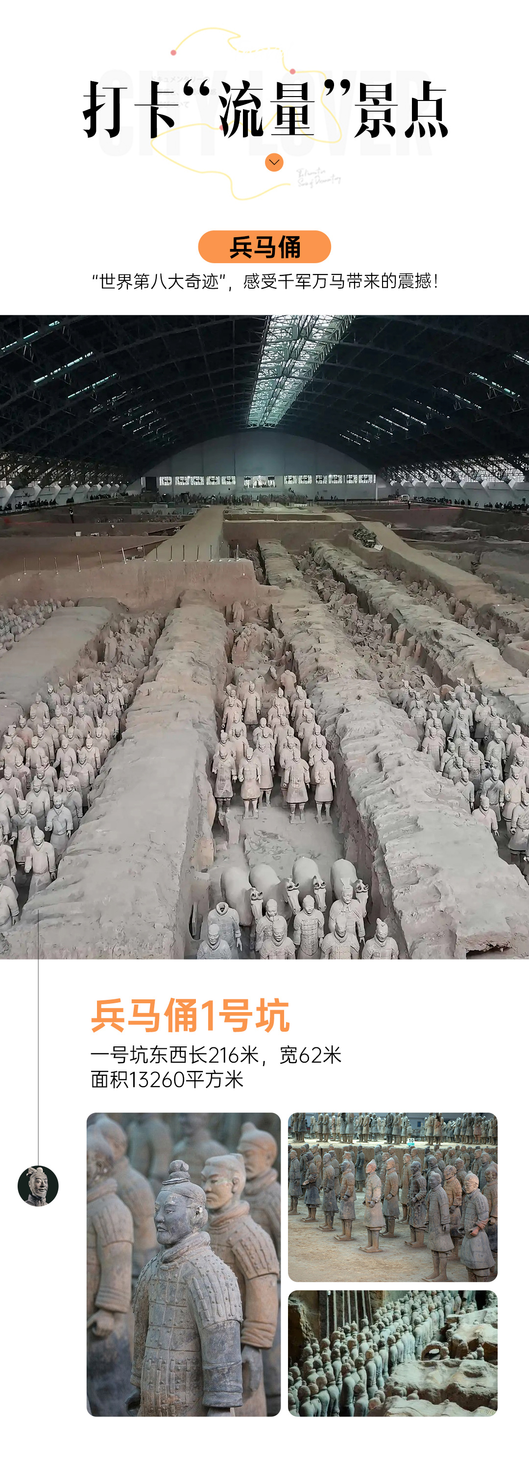 兵马俑:世界考古史上最伟大的发现之一,被誉为“世界第八大奇迹”。位于今西安市临潼区,是秦始皇陵陪葬坑的一部分。其规模宏大、数量众多、塑造精美、神态各异,被列入世界文化遗产的保护名录。