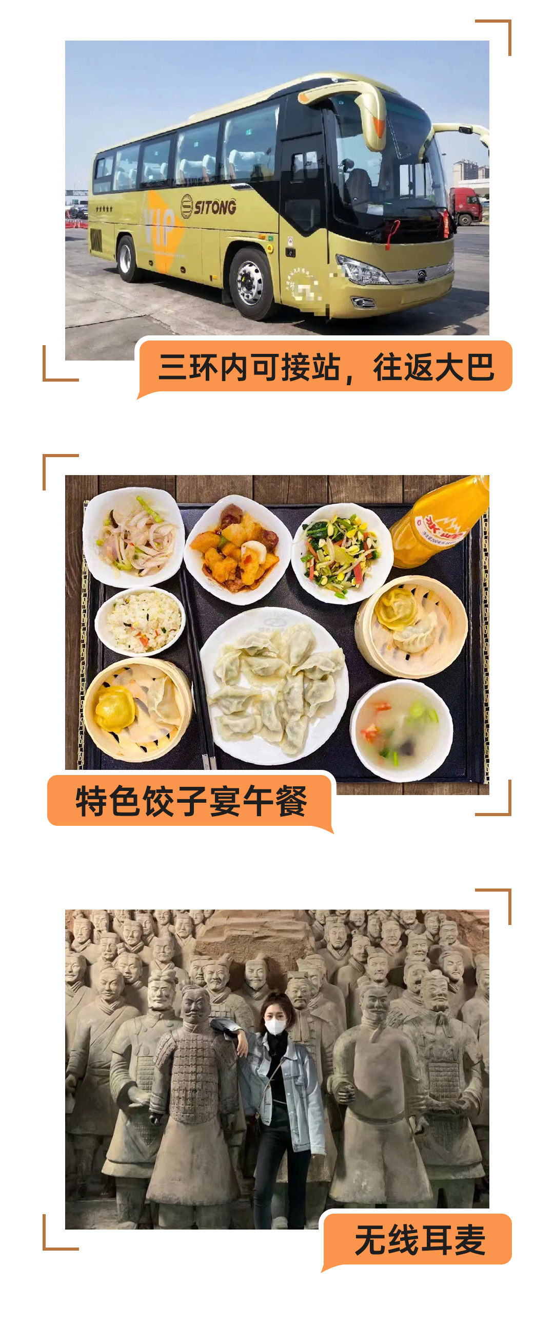 | 景区交通 | 兵马俑电瓶车5元/人、骊山电瓶车20元/人、骊山索道70元/人; |