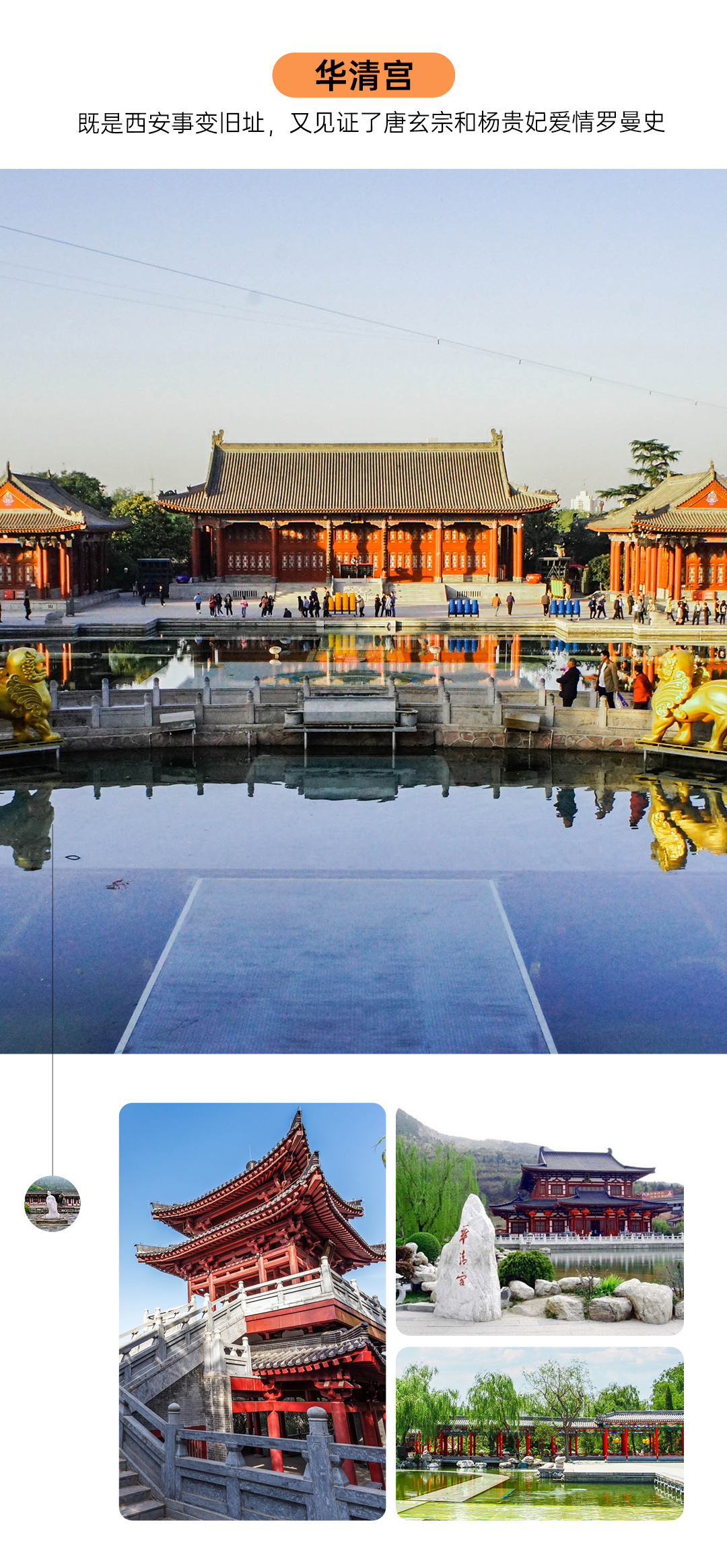 唐华清宫御汤遗址,可看到天下第一温泉—唐御汤遗址、著名的九龙湖景区、唐玄宗与杨贵妃七夕盟誓之地长生殿、皇家艺术学院梨园。 另外还可以看到上世纪三十年代震惊中外的“西安事变”发生地—五间厅、具有六千年的温泉利用史的骊山温泉等等。